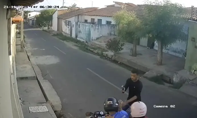 Câmeras de segurança flagraram um assalto nas primeiras horas da manhã desta terça-feira (21) na rua 4 do bairro Mutirão em Timon. O ladrão armado de revólver rende um casal quando o mesmo está saindo de casa e leva a motocicleta.