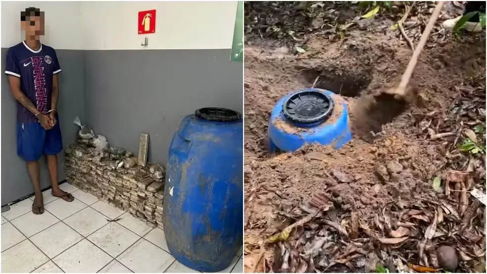 Segundo a polícia, o material seria maconha e estava dentro de um tonel, que foi enterrado por um suposto traficante, conhecido como ‘Lahvozier’, que foi preso.