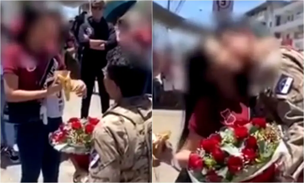 O policial se ajoelha, e a adolescente recebe os presentes e um beijo do militar, para risos e comemorações de colegas da escola que acompanharam tudo. Ele coloca o anel no dedo da menina, recebendo um abraço em seguida da garota.
