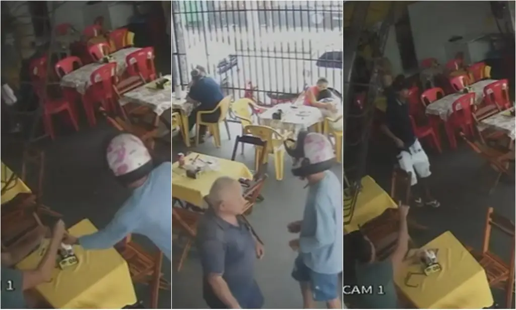Nas imagens, é possível observar o momento em que um homem, vestindo uma camiseta preta, entra no restaurante e aborda um cliente. Pouco depois, um segundo suspeito, utilizando um capacete rosa, entra para auxiliar na execução do crime.