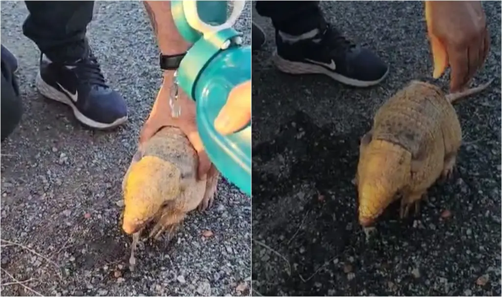 Empresário compartilhou vídeo do momento do encontro com o animal em suas redes sociaisO empresário piauiense Gelfran Santos encontrou um tatu na beira da BR-407, estrada que interliga os municípios de Picos e Paulistana. Em um vídeo publicado em suas redes sociais, o empresário, acompanhado de um amigo, aparece dando água ao animal que apresentava sinais de sede. A dupla ainda aproveita a ocasião para refrescar o corpo do tatu.