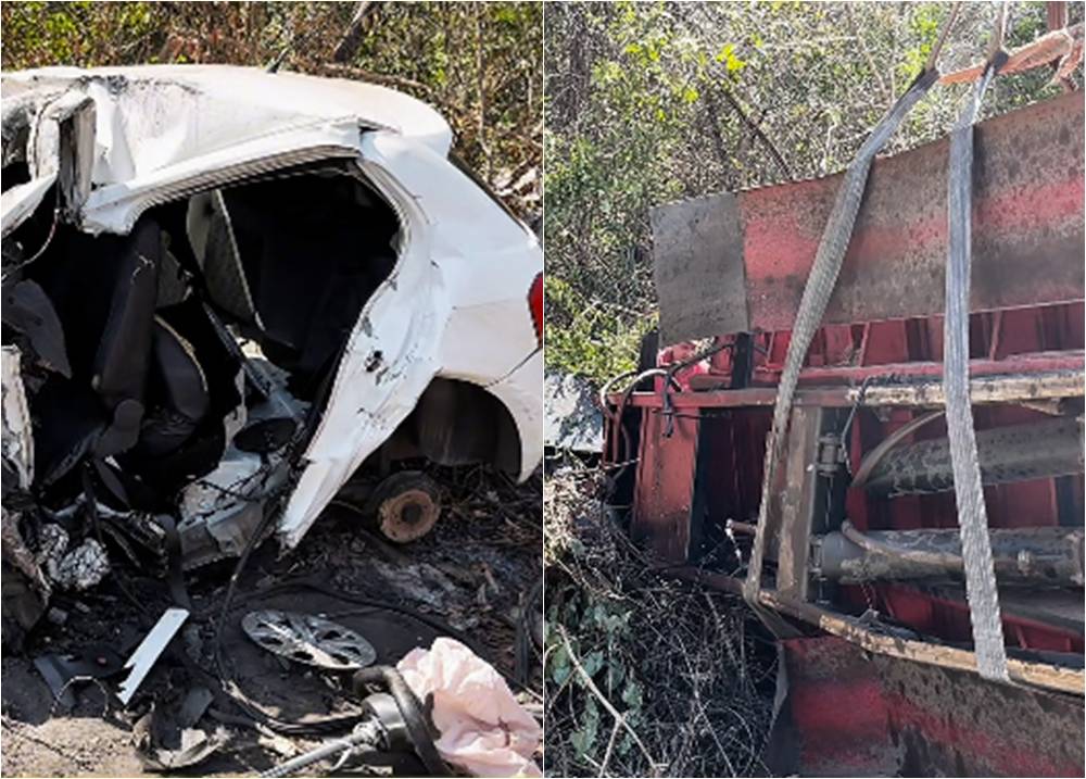 No local, os destroços do veículo ainda podem ser vistos às margens da rodovia, enquanto a caçamba envolvida no acidente estava sendo removida pelos responsáveis pelo veículo.