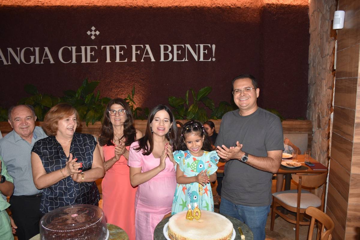 A médica Sariane Ribeiro celebrou seus 40 anos com uma festa intimista no restaurante Vignoli, na zona Leste de Teresina, ao lado do esposo, o juiz do TRE Fábio Viana, e da filha, Liz Viana, reunindo familiares e amigos próximos.