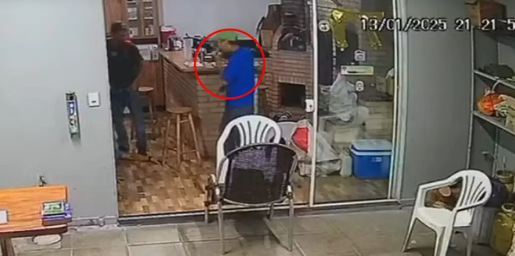 A invasão aconteceu enquanto três pessoas estavam na casa. Após renderem as vítimas, um dos homens aparece comendo carne antes de continuar o roubo.