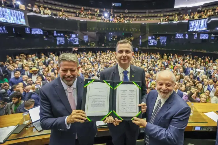 A votação do texto havia sido concluída pela Câmara dos Deputados no último dia 15. Lula compareceu à cerimônia, realizada no Plenário da Câmara, que também contou com as presenças do presidente do Senado e Congresso, Rodrigo Pacheco (PSD-MG); da Câmara dos Deputados, Arthur Lira (PP-AL); e do Supremo Tribunal Federal (STF), Luís Roberto Barroso, além dos ministros Fernando Haddad (Fazenda) e Simone Tebet (Planejamento), e centenas de deputados e senadores.