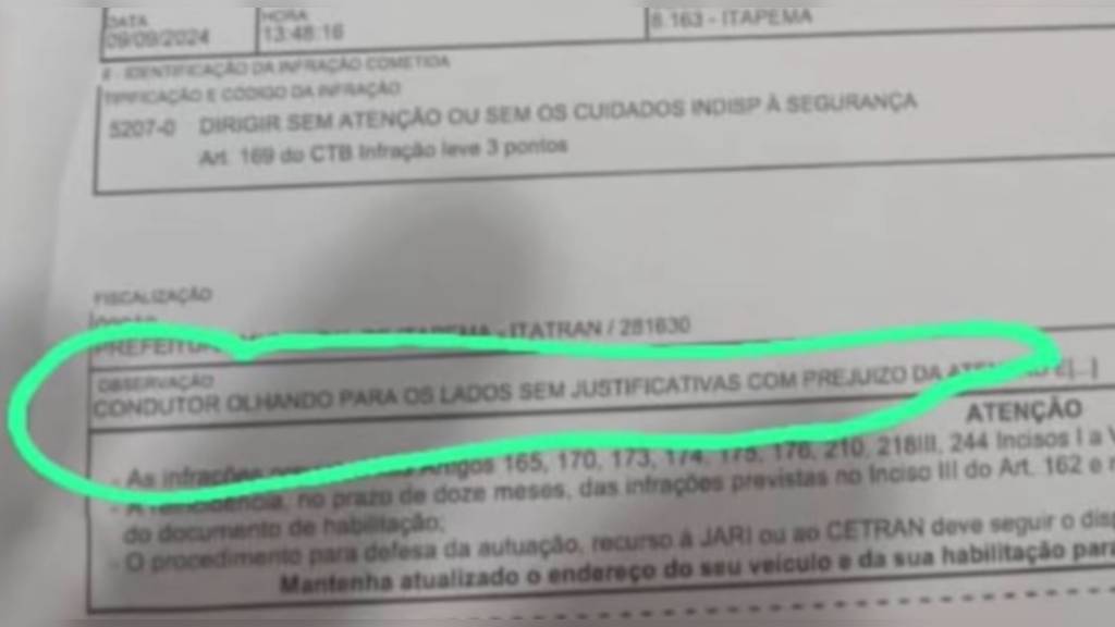 Suposta infração gerou repercussão nas redes sociais devido justificativa da multaUm motorista da cidade de Itapema, em Santa Catarina, foi multado por “dirigir sem os cuidados necessários à segurança no trânsito”. A justificativa para a aplicação da multa, segundo o relatório, foi que o condutor estava “olhando para os lados” enquanto dirigia. A infração gerou debate nas redes sociais após ser divulgada em um vídeo por Ramos, policial e candidato a vereador no município.