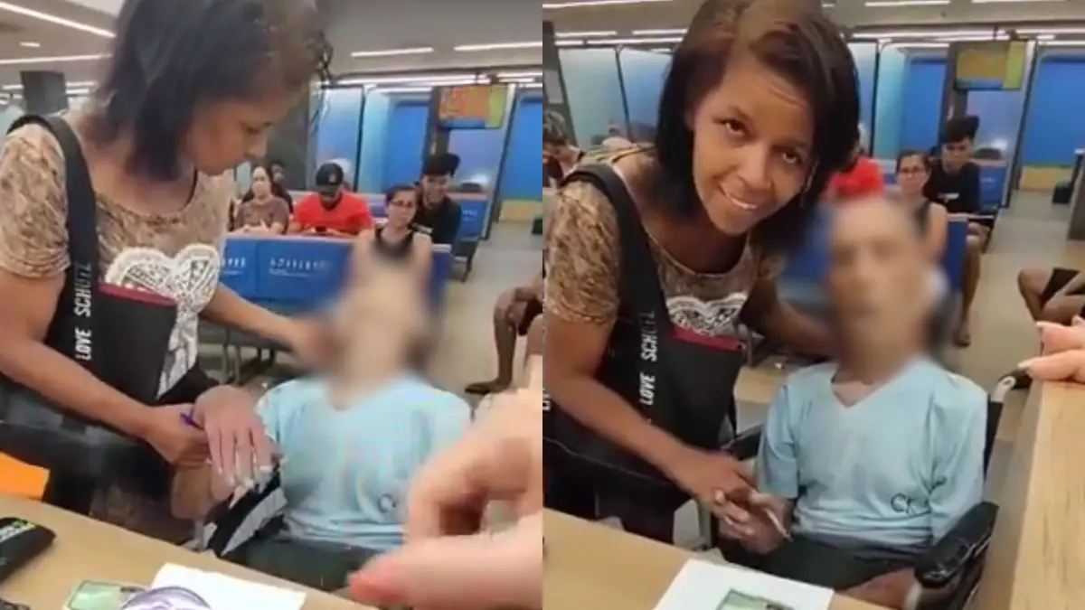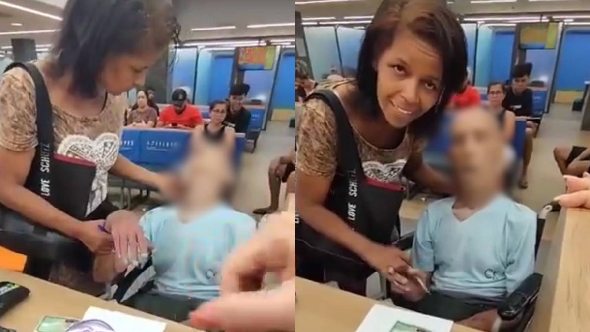 Um vídeo, feito por funcionárias do banco, mostra que a todo tempo ela tentava manter a cabeça do homem reta, usando a mão e conversa com o suposto parente.