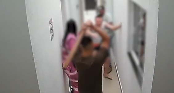 O irmão, de camisa marrom e calça preta, entra no quarto com um taco de beisebol nas mãos e começa desferir vários golpes no marido da vítima da traição. A suposta amante foi tortura e teve seu cabelo raspado pela esposa traída.