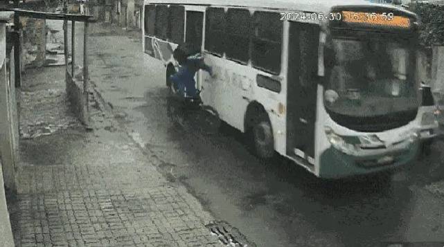 No vídeo, é possível ver o momento em que o ônibus passa raspando no jovem, fazendo com que ele caísse, e por um triz, não foi parar debaixo do veículo.