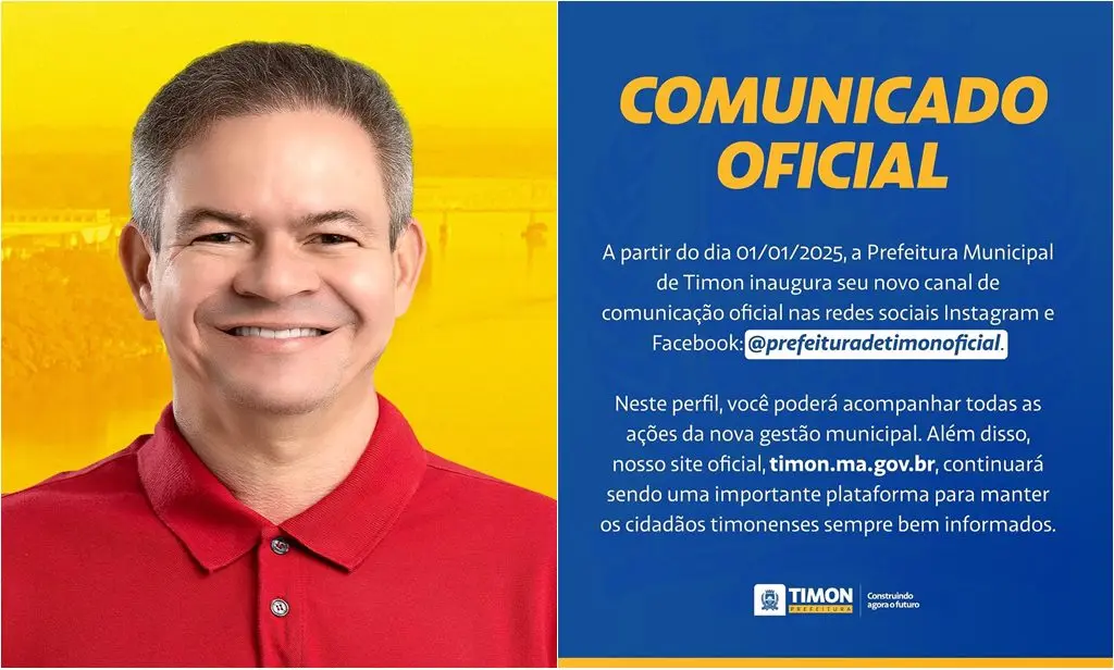 Além dos novos perfis, o site oficial da Prefeitura (timon.ma.gov.br) continuará funcionando como uma plataforma complementar de informações e serviços essenciais.