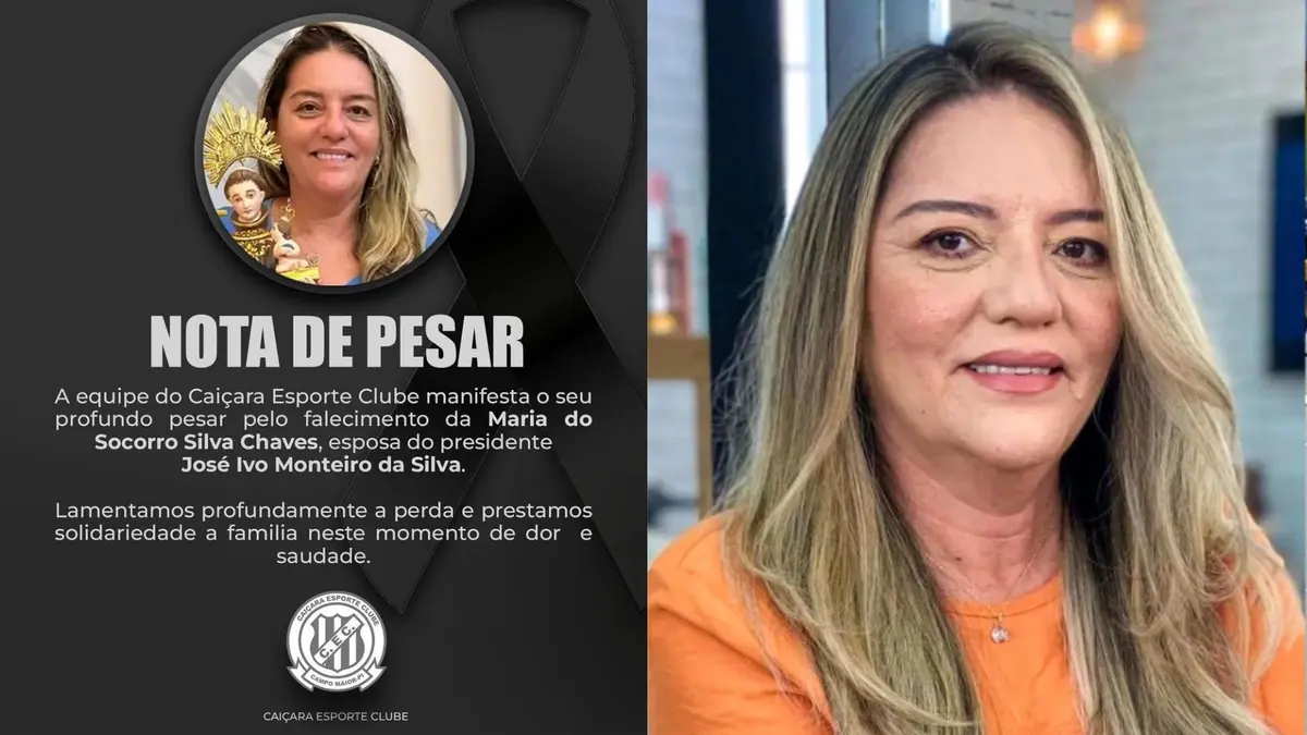 Maria do Socorro foi vítima de acidente na manhã desta quinta (05) na cidade de Campo MaiorO clássico entre Caiçara e Comercial, que estava marcado para acontecer no próximo sábado (07/09), está adiada devido à morte da esposa do presidente do Caiçara, Maria do Socorro Silva Chaves. A informação fi confirmada pela Federação de Futebol do Piauí (FFP). A mulher foi vítima de acidente na manhã de hoje na cidade de Campo Maior. O clube é presidido pelo empresário da cidade José Ivo Monteiro da Silva.