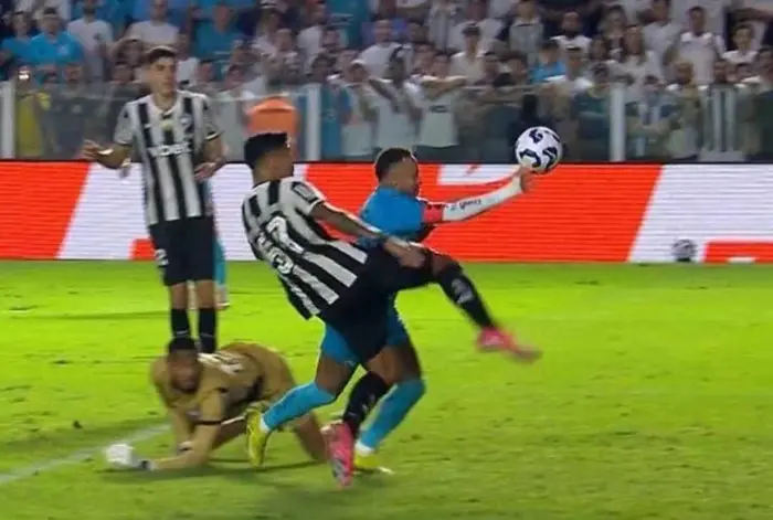 O cartão vermelho veio aos 29 minutos do segundo tempo. Após chute do atacante Álvaro Barreal e rebote do goleiro John, Neymar esticou a mão e mandou a bola para o gol. O lance foi anulado e o camisa 10, que já tinha recebido um amarelo na etapa inicial, foi novamente punido, agora com a expulsão.