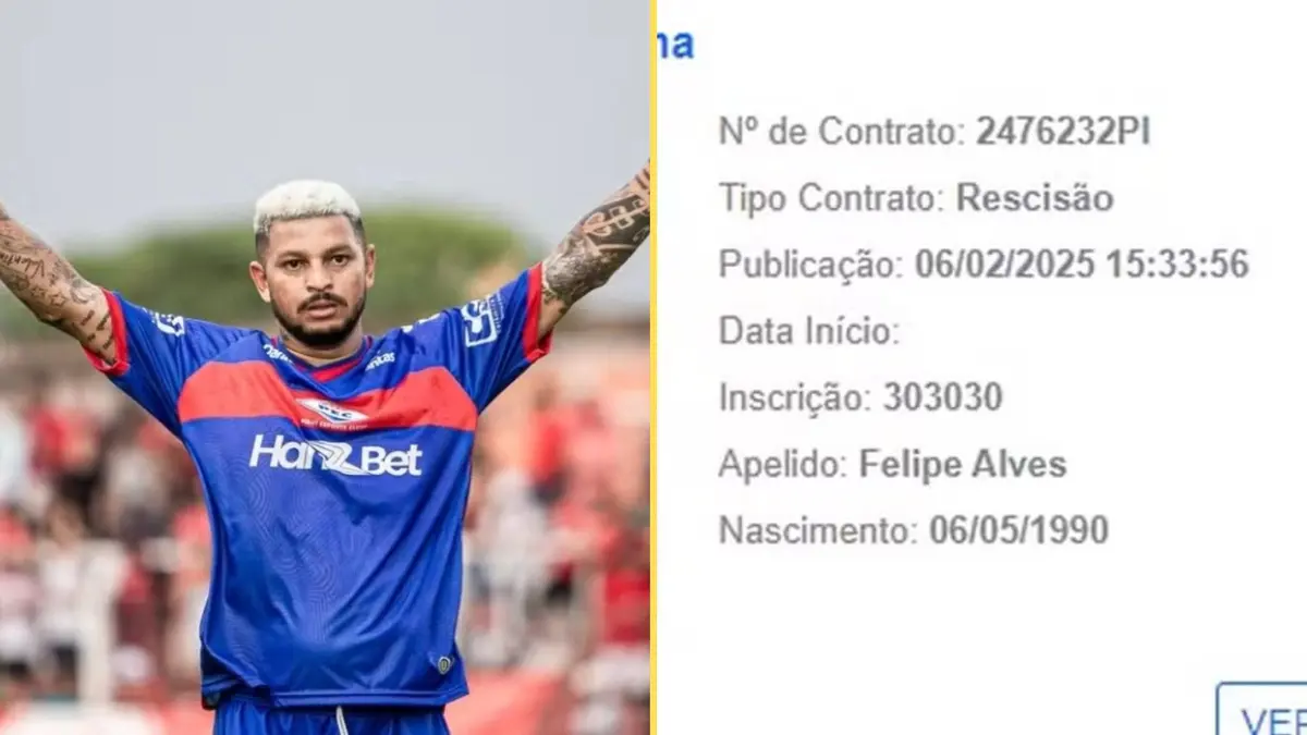 Felipe Alves já estava afastado e não fazia mais parte do grupo de jogadores que treinam no CTO atacante Felipe Alves Lima teve a rescisão de seu contrato com o Piauí Esporte Clube oficialmente publicada. O jogador e o clube encerraram o vínculo após o atleta ser preso em flagrante no último domingo, acusado de tentativa de estupro contra uma funcionária do próprio clube. O caso foi reclassificado como importunação sexual durante audiência de custódia realizada na segunda-feira.