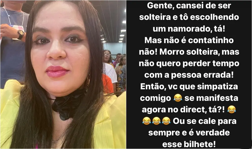 “Gente, cansei de ser solteira e tô escolhendo um namorado, tá! Mas não é contatinho não! Morro solteira, mas não quero perder tempo com a pessoa errada! Então, vc que simpatiza comigo & se manifesta agora no direct, tá?! e e Ou se cale para sempre e é verdade esse bilhete”, postou.