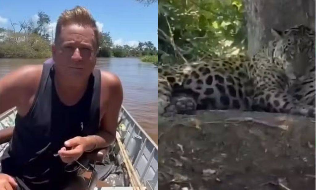 Nas imagens, a onça está descansando sob a sombra de uma árvore enquanto o cantor observa a cena de uma embarcação.