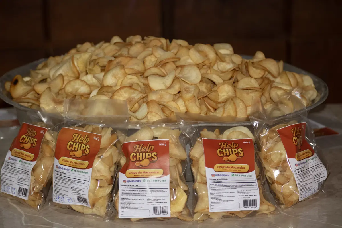 Nas prateleiras de um mercadinho local, os chips de macaxeira da Help Chips chamam a atenção com sua embalagem artesanal e apelo regional. A presença do produto evidencia o sucesso da produção familiar, que conquista espaço no comércio da cidade e valoriza a cultura alimentar de Demerval Lobão.