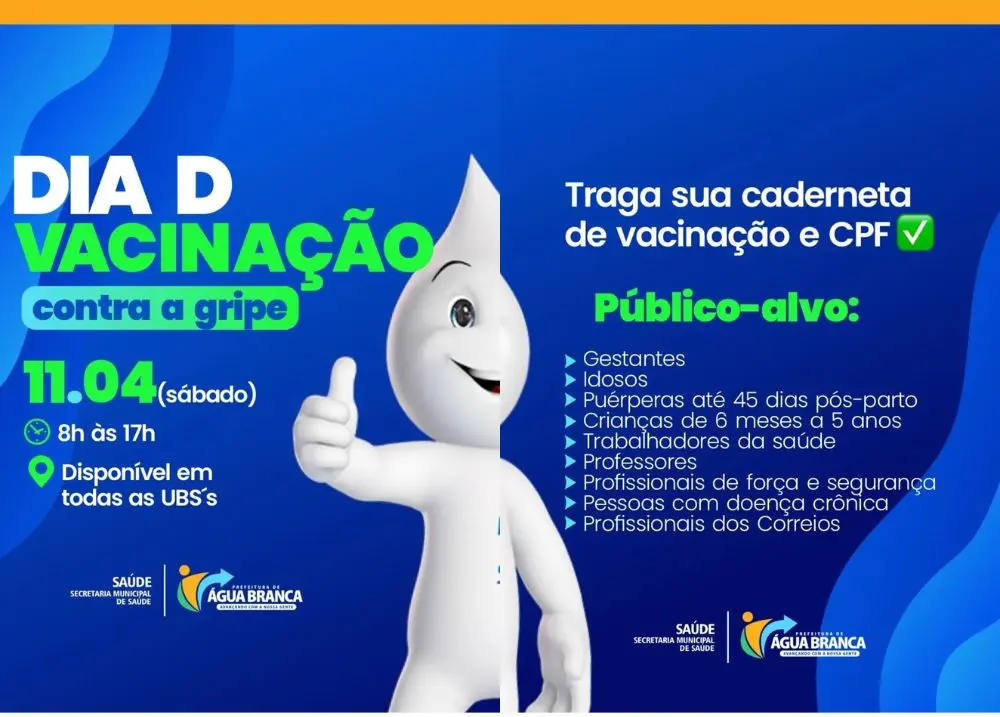 Imunização acontece em todas as UBS’s e é voltada a grupos prioritáriosA Prefeitura de Água Branca, por meio da Secretaria Municipal de Saúde, promove neste sábado (11) o Dia D de vacinação contra a gripe. A mobilização acontece das 8h às 17h, com atendimento disponível em todas as Unidades Básicas de Saúde (UBS’s) do município.