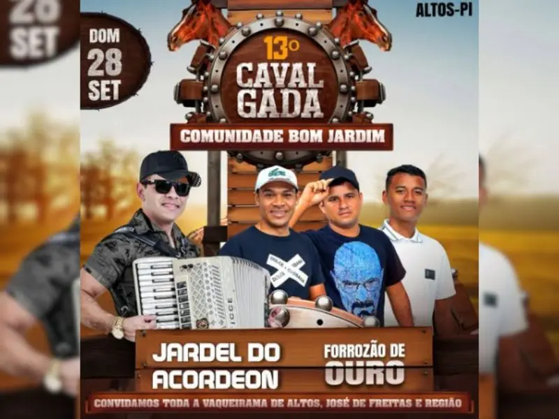 Evento promete reunir vaqueiros, famílias e visitantes de Altos, José de Freitas e regiãoA cidade de Altos já está em contagem regressiva para a realização da 13ª Cavalgada da Comunidade Bom Jardim, que acontece no próximo dia 28 de setembro. O evento promete reunir vaqueiros, famílias e visitantes de Altos, José de Freitas e região em uma grande celebração cultural e festiva.