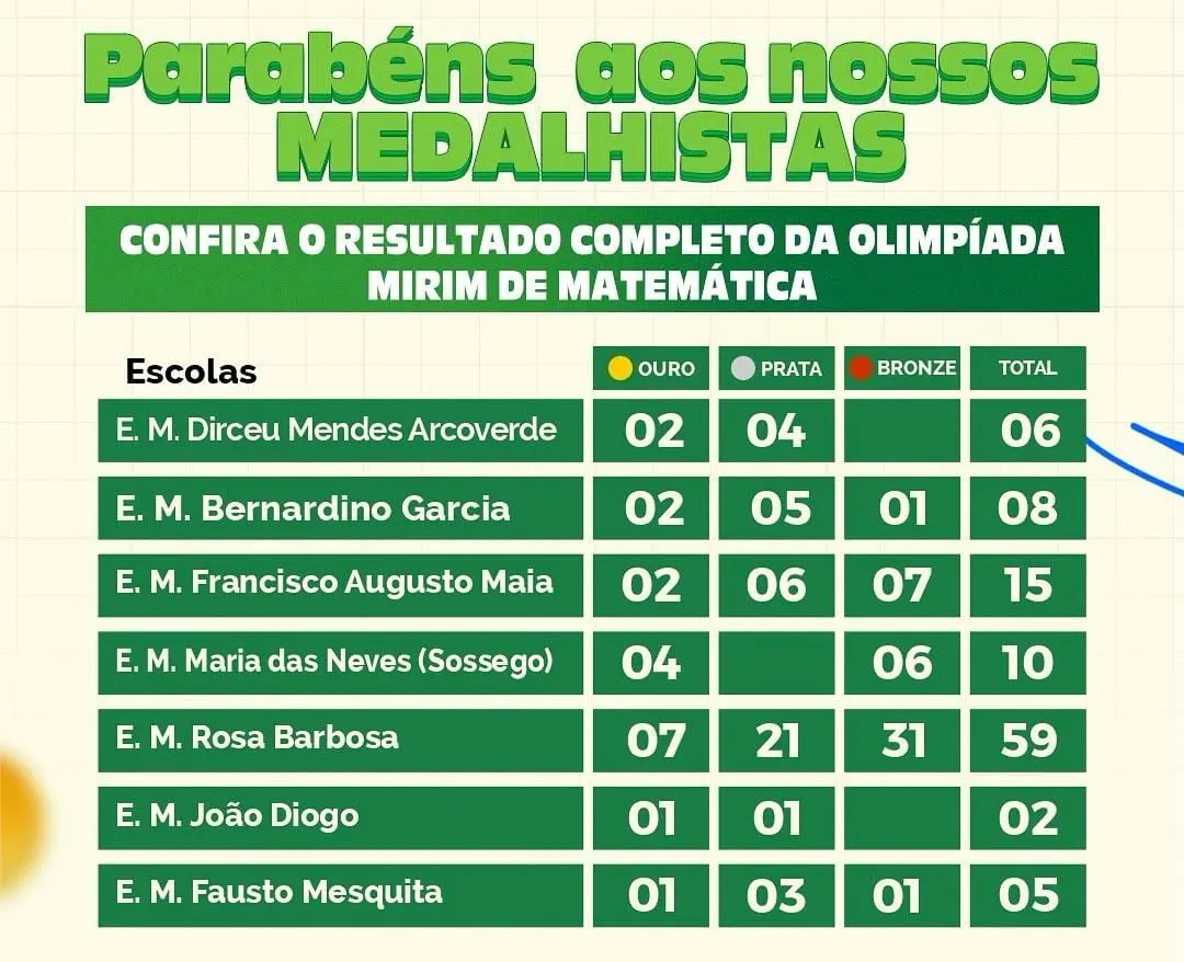 Estudantes de escolas municipais de São João do Arraial conquistaram 105 medalhas na 4ª edição da Olimpíada Mirim de Matemática, realizada em 2025. O resultado foi divulgado pela Secretaria Municipal de Educação.