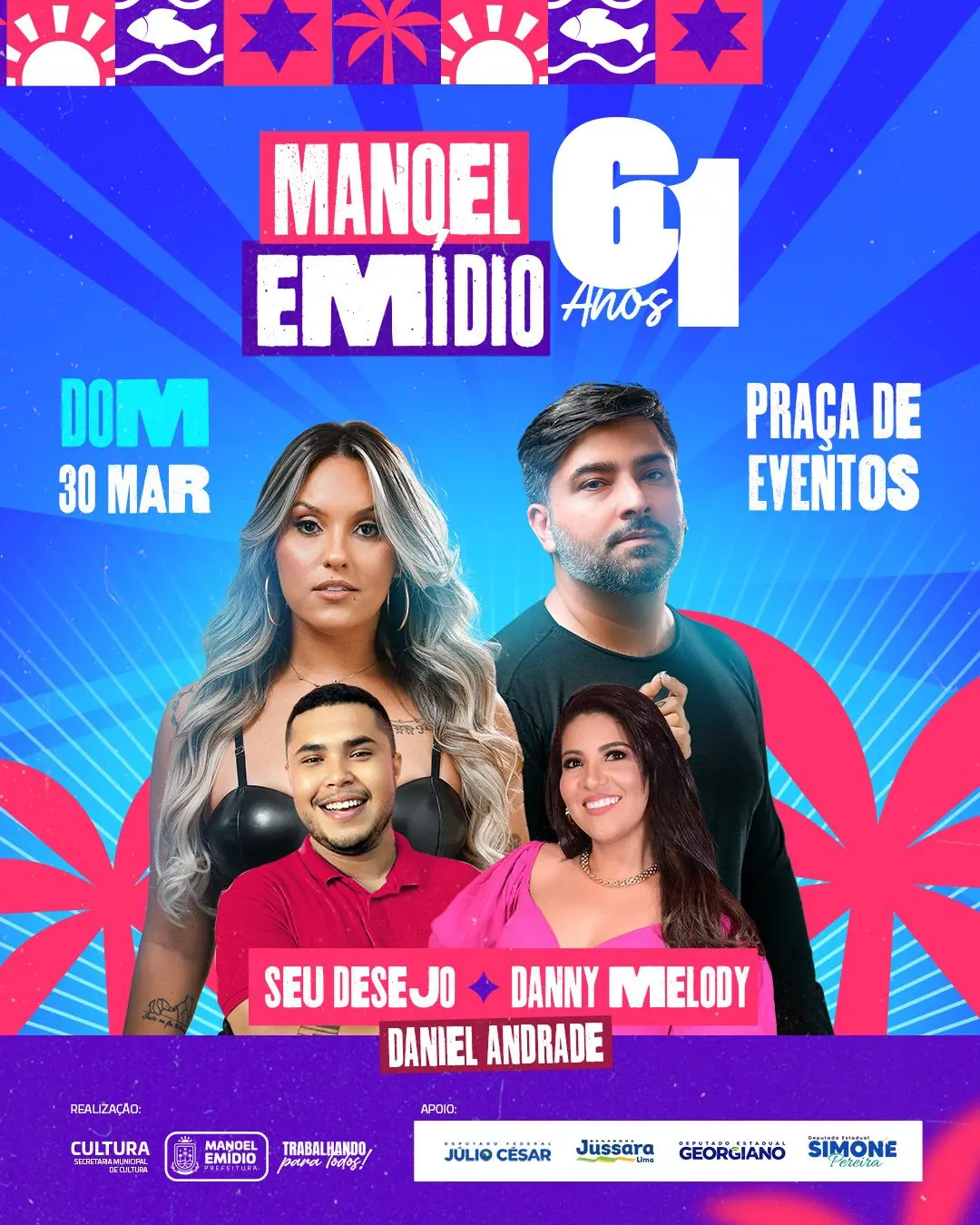Cidade comemora 61 anos com competições esportivas, brincadeiras tradicionais e shows musicaisA cidade de Manoel Emídio comemora seus 61 anos com uma programação especial nos dias 29 e 30 de março, trazendo diversas competições esportivas, atividades infantis e um grande show de encerramento.