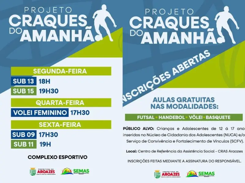 Aulas gratuitas de futsal, vôlei, basquete e handebol para adolescentes de 12 a 17 anos.O Projeto Craques da Manhã, que acontece no município de Aroazes, está com inscrições abertas para aulas gratuitas de futsal, handebol, vôlei e basquete, oferecendo uma oportunidade única para adolescentes de 12 a 17 anos. O programa é voltado para crianças e jovens que fazem parte do Núcleo de Cidadania dos Adolescentes (NUCA) e/ou do Serviço de Convivência e Fortalecimento de Vínculos (SCFV).