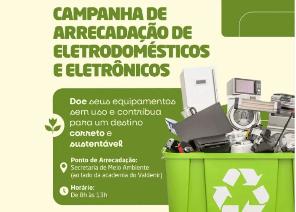 Interessados em doar podem ir à Secretaria de Meio Ambiente até esta quarta-feira (19/11)A Secretaria Municipal de Meio Ambiente de Aroazes está recebendo eletrodomésticos e eletrônicos sem uso até esta quarta-feira (19/11). A ação faz parte de uma campanha de arrecadação para garantir que os itens tenham um destino correto e sustentável.