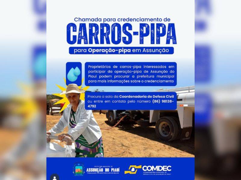 Ação é realizada em conjunto com a Coordenadoria Municipal de Defesa CivilA Prefeitura de Assunção do Piauí está se mobilizando para enfrentar os efeitos da seca no município. Por meio da Coordenadoria Municipal de Defesa Civil (COMDEC) e em parceria com a 10ª Região Militar, Escritório Avançado da Operação Carro-Pipa, a gestão municipal iniciou nessa quinta-feira (11), o credenciamento de veículos para a Operação Carro-Pipa.