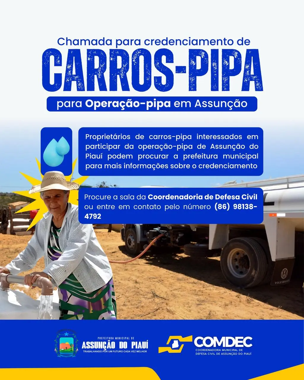 Medida visa mitigar os efeitos da estiagem prolongada que afeta a regiãoA Prefeitura Municipal de Assunção do Piauí, por meio da Coordenadoria Municipal de Defesa Civil (COMDEC) e em parceria com a 10ª Região Militar – Escritório Avançado da Operação Carro-Pipa, iniciou o processo de credenciamento de carros-pipa para a Operação Pipa no município. A medida visa mitigar os efeitos da estiagem prolongada que afeta a região, garantindo o abastecimento de água para a população rural e urbana.