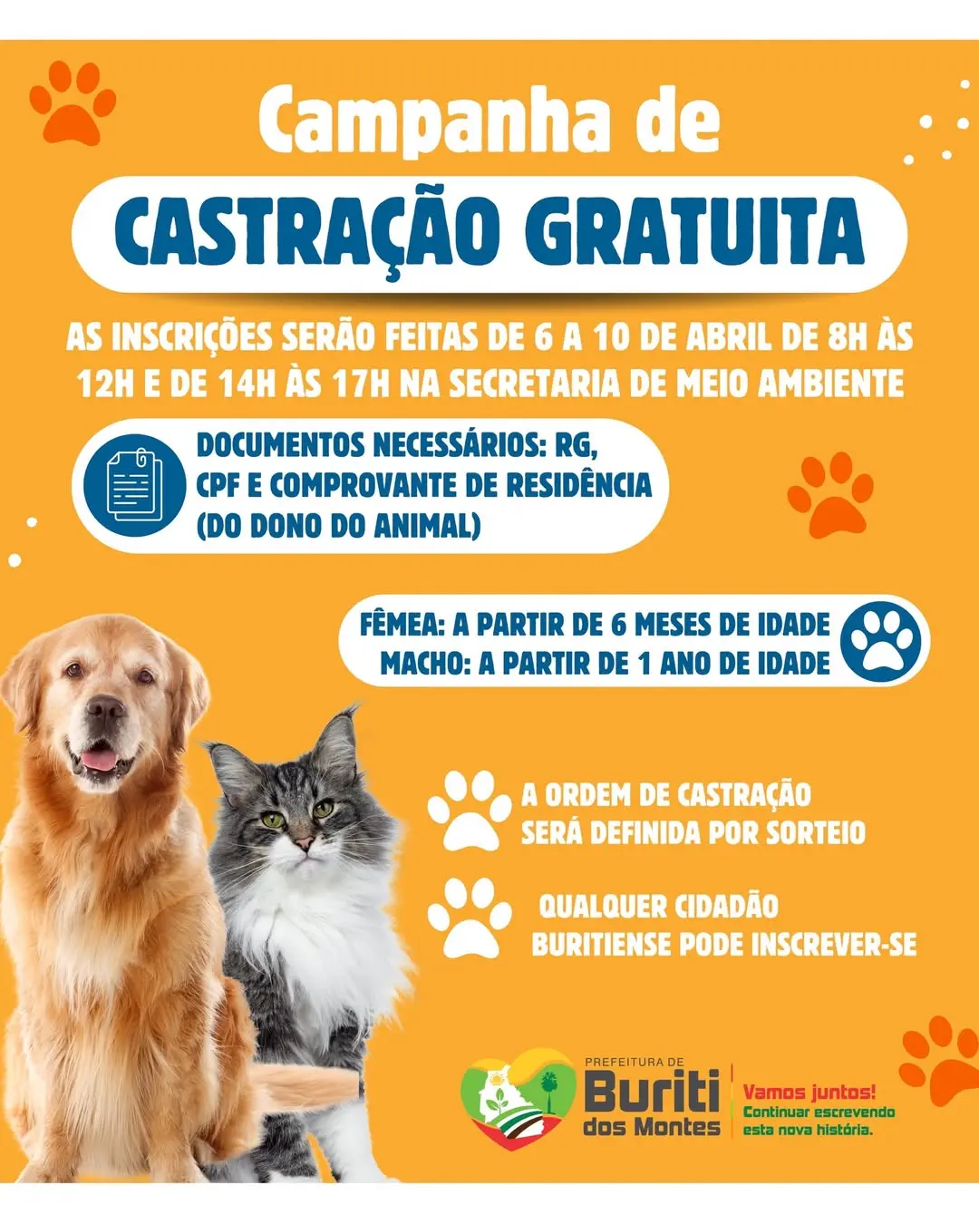 A Prefeitura de Buriti dos Montes está promovendo uma campanha de castração de animais, com o objetivo de incentivar o controle populacional e garantir mais saúde e qualidade de vida para cães e gatos no município.