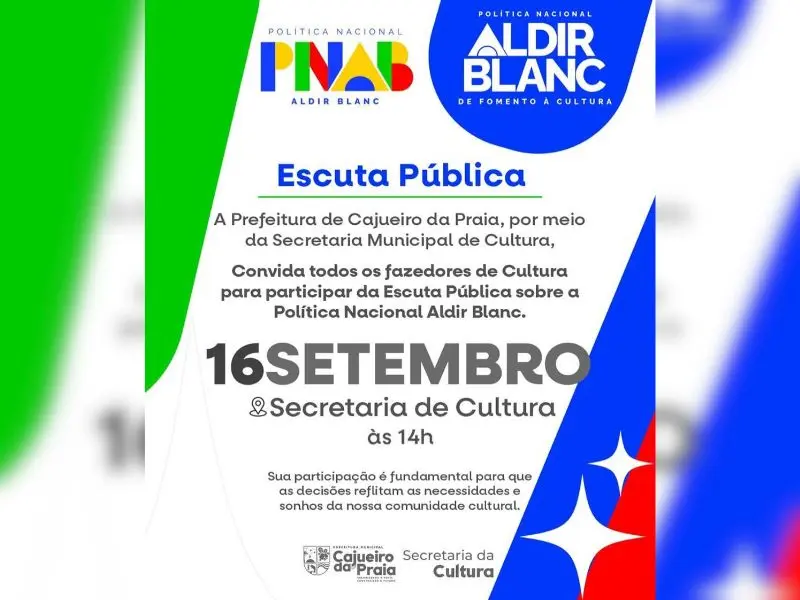 Encontro está marcado para 16 de setembro na sede da própria Secretaria de CulturaCajueiro da Praia se prepara para um momento crucial de diálogo e participação. A Prefeitura Municipal, através da Secretaria de Cultura, convida os fazedores de cultura da região para a Escuta Pública da Política Nacional Aldir Blanc (PNAB). O encontro, que visa debater e colher sugestões da comunidade cultural local, está marcado para 16 de setembro, às 14h, na sede da própria Secretaria de Cultura.