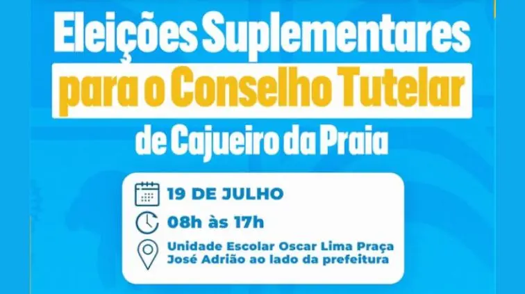 População vai às urnas no dia 19 de julho para fortalecer direitos da infância e juventudeCajueiro da Praia se prepara para um momento importante na defesa dos direitos das crianças e adolescentes do município. No próximo dia 19 de julho, a população poderá participar das eleições suplementares para o Conselho Tutelar, um processo democrático essencial para o fortalecimento da proteção da infância e juventude.