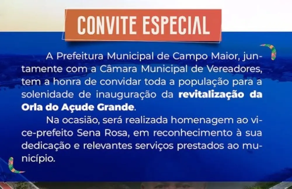Evento reforça ações de lazer, turismo e convivência para a comunidade de Campo MaiorA Prefeitura Municipal de Campo Maior, em parceria com a Câmara Municipal de Vereadores, convida a população para a solenidade de inauguração da revitalização da Orla do Açude Grande, marcada para o próximo sábado, 16 de agosto.