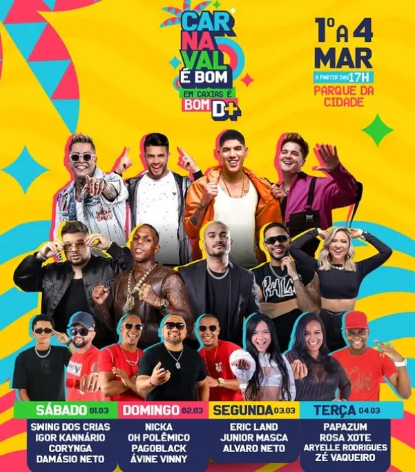 A grande festa, intitulado “Carnaval é bom, em Caxias é bom D+”, contará com artistas de diferentes gêneros musicais, garantindo diversão para todos os públicos. Confira a programação completa: