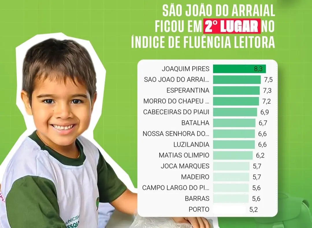 Ações de acompanhamento pedagógico e valorização profissional impulsionam resultadosO município de São João do Arraial alcançou a segunda colocação no Índice de Fluência Leitora do Território dos Cocais, registrando a nota 7,5. O resultado representa um avanço significativo em relação a 2024, quando o índice foi de 6,9, confirmando a evolução consistente da educação municipal.