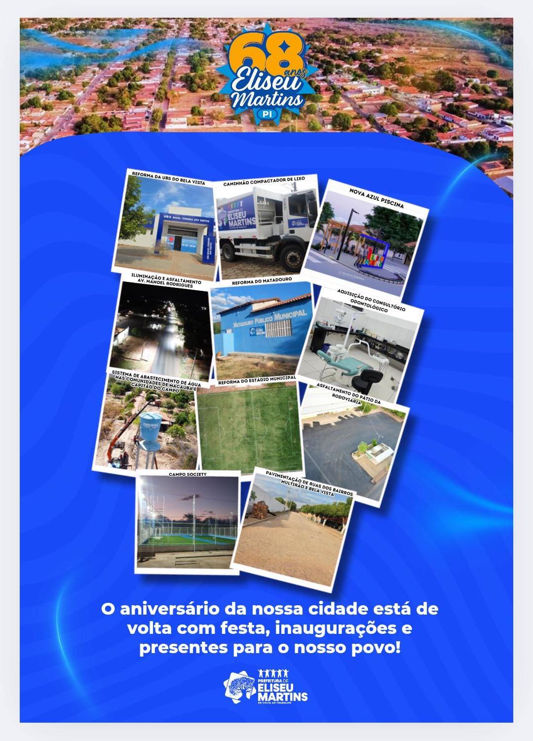 O município de Eliseu Martins celebra nesta sexta-feira (24) seus 68 anos de emancipação política com uma grande festa aberta ao público. A comemoração integra uma semana especial de atividades culturais e eventos em homenagem à história e à população da cidade.