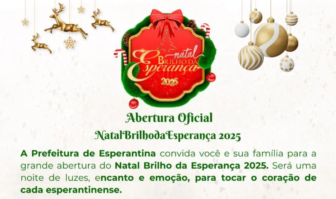 Evento acontece dia 29, às 19h, com atrações culturais e chegada do Papai NoelA magia do Natal vai tomar conta de Esperantina no dia 29 de novembro, com a abertura oficial do Natal Brilho da Esperança 2025, promovido pela Prefeitura Municipal. O evento acontece às 19h, na Praça Leônidas Melo, e promete encantar o público com uma programação especial preparada para toda a família.