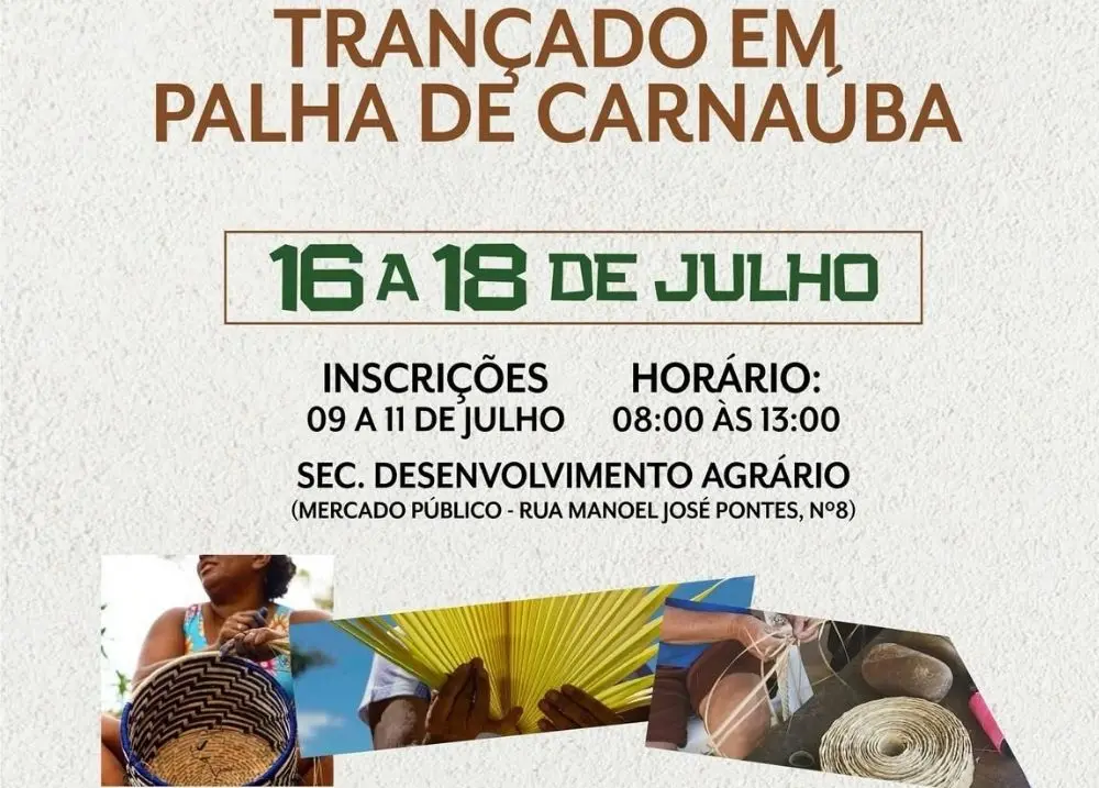 A Prefeitura de Esperantina, por meio da Secretaria Municipal de Desenvolvimento Agrário, tem o orgulho de anunciar o curso gratuito de “Trançado em Palha de Carnaúba”, uma arte tradicional que valoriza, preserva e impulsiona a identidade cultural da nossa região.