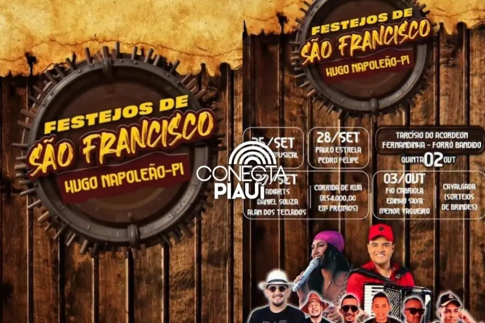 Os Festejos de São Francisco 2025 terão início nesta sexta-feira (26/09) em Hugo Napoleão. A Prefeitura organizou uma programação variada, que reúne tradição, cultura e grandes atrações musicais.