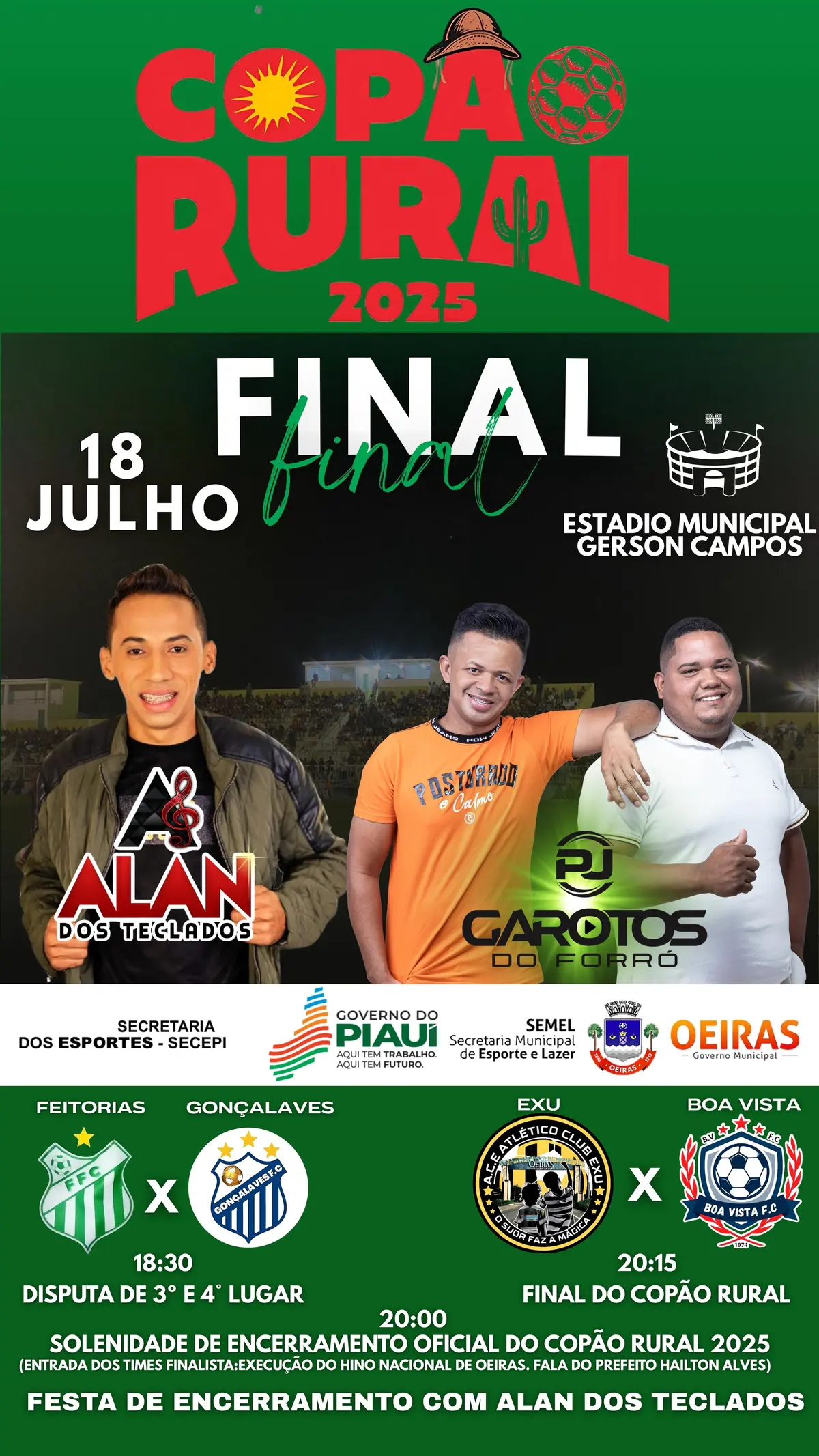Boa Vista e Gonçalves disputam título no Estádio Gerson Campos; evento terá show e solenidadeO município de Oeiras será palco, nesta sexta-feira (18/07), da grande final do Copão Rural 2025, considerado o maior campeonato de futebol amador da região. A decisão acontece no Estádio Municipal Gerson Campos, com programação a partir das 18h30 e entrada gratuita para o público.