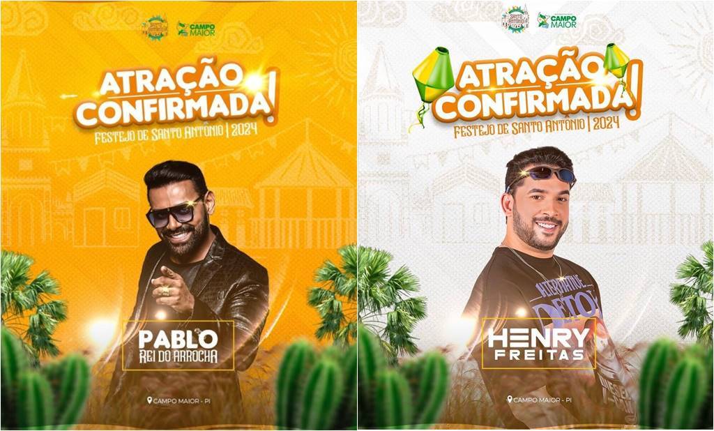 Os festejos do padroeiro acontecem no período de 31 de maio ao dia 13 de junhoA Prefeitura de Campo Maior anunciou, o cantor Henry Freitas e Pablo Rei do Arrocha, entre as atrações que irão animar a edição 2024 do Festejo de Santo Antonio. Os festejos do padroeiro acontecem no período de 31 de maio ao dia 13 de junho.