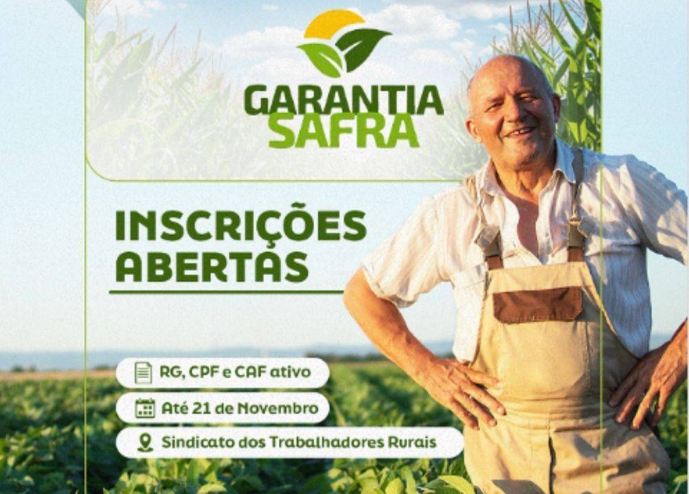 A Prefeitura de Lagoa do Piauí informa que estão abertas as inscrições para o programa Garantia-Safra, que oferece proteção aos agricultores familiares em casos de perdas na colheita causadas pela seca ou pelo excesso de chuva.
