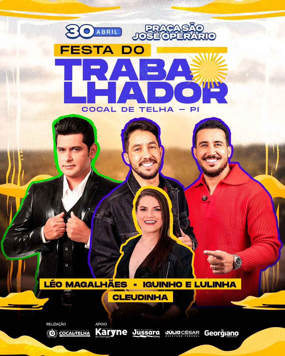 O evento se consolida como um momento de lazer e comemoração para os trabalhadoresA prefeita de Cocal de Telha, Karyne do Rodriguão, anunciou em suas redes sociais as atrações da Festa do Trabalhador 2025, um dos eventos mais aguardados da região. A grande festa acontecerá no dia 30 de abril, na Praça São José Operário, prometendo uma noite inesquecível para a população.