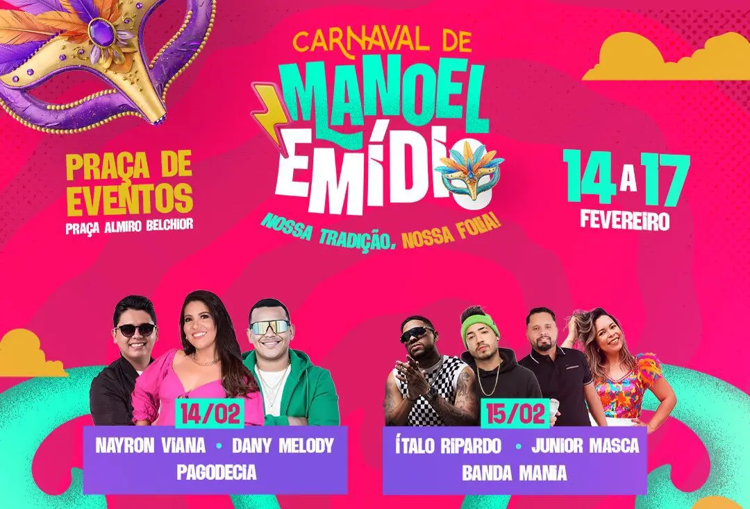 Carnaval 2026 acontece de 14 a 17 de fevereiro na Praça Almiro BelchiorA cidade de Manoel Emídio, no sul do Piauí, já está em clima de festa com a chegada do Carnaval 2026, que promete quatro dias de muita animação, música e tradição popular. O evento será realizado entre os dias 14 e 17 de fevereiro, na Praça de Eventos Almiro Belchior, reunindo artistas locais e regionais em uma programação pensada para agradar todos os públicos.