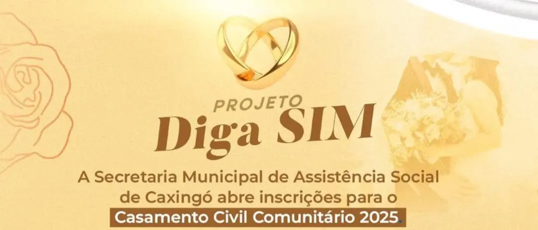 A Secretaria Municipal de Assistência Social de Caxingó abriu inscrições para o Casamento Civil Comunitário 2025, por meio do projeto ‘Diga Sim’. O período vai de 29/09 a 10/10, no CRAS, das 7h30 às 16h.
