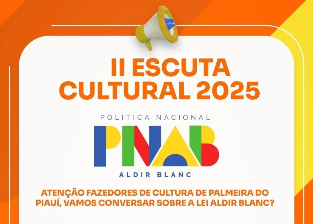 Encontro reunirá fazedores de cultura para debater a Política Nacional Aldir Blanc 2025A cidade se prepara para mais um importante momento de escuta e diálogo com os agentes culturais locais. A II Escuta Cultural de Palmeira do Piauí acontece nesta quinta-feira, 28 de agosto de 2025, na Câmara Municipal, a partir das 19h, com foco na Política Nacional Aldir Blanc (PNAB).