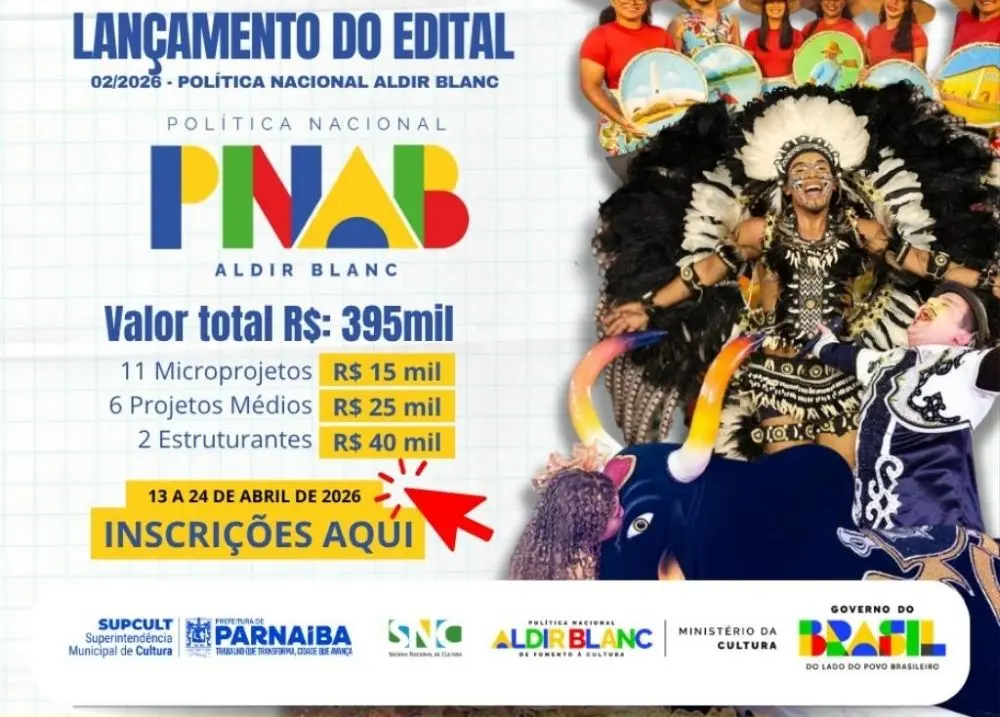 Inscrições seguem até 24 de abril e contemplam artistas e fazedores de culturaA Prefeitura de Parnaíba, por meio da Superintendência de Cultura, publicou o edital 02/2026 da Política Nacional Aldir Blanc, ampliando as oportunidades para artistas, grupos e fazedores de cultura do município.