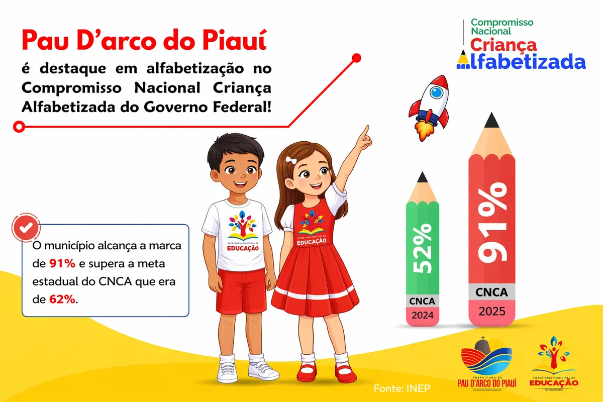 O índice de alfabetização chegou a 91% em 2025, resultado que coloca a cidade acima da meta estadualO município de Pau D'Arco do Piauí alcançou destaque no Compromisso Nacional Criança Alfabetizada (CNCA), programa do Governo Federal voltado ao fortalecimento da alfabetização na idade certa. De acordo com dados divulgados pela Prefeitura, por meio da Secretaria Municipal de Educação, o índice de alfabetização chegou a 91% em 2025, resultado que coloca a cidade acima da meta estabelecida para o estado.