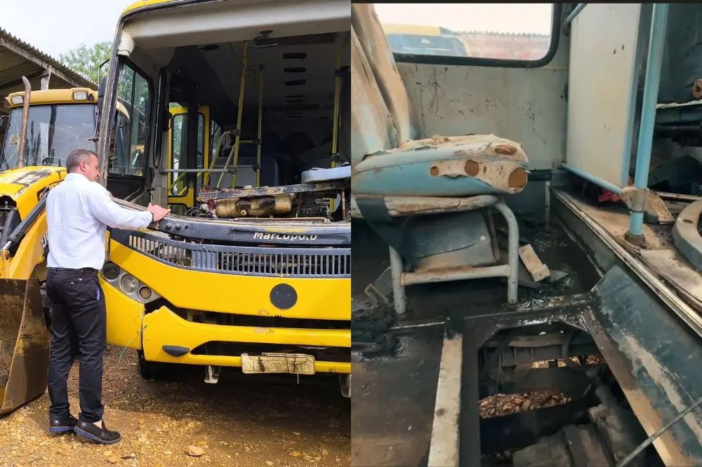 "Estamos aqui hoje na garagem da prefeitura para nós conferirmos a frota dos ônibus escolares... Essa é a nossa real situação dos ônibus escolares de Curimatá. Estamos aqui de nove ônibus, três estão funcionando e seis estão nessa situação que vocês estão vendo. Faltando motor, caixa de marcha, vidro", afirmou o prefeito, evidenciando o estado crítico dos veículos.