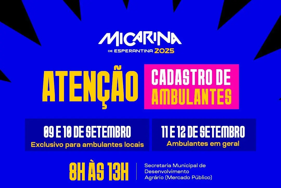 O processo será realizado no Mercado Público, no período de 9 a 12 de setembro, sempre das 8h às 13hA Prefeitura de Esperantina, por meio da Secretaria Municipal de Desenvolvimento Agrário, dará início ao cadastro de ambulantes que irão atuar durante a Micarina de Esperantina 2025, que acontecerá nos dias 26 e 27 de setembro.