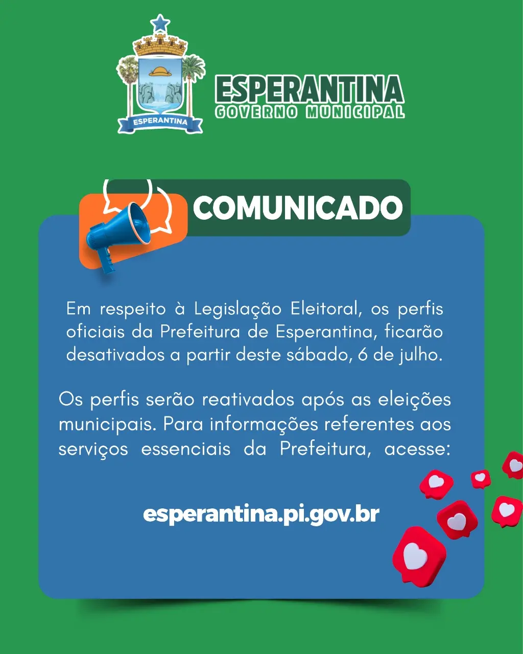 Redes sociais e comunicação oficial serão desativadas a partir de 06 de julho até o fim das eleiçõesA Prefeitura de Esperantina comunica que irá desativar as redes sociais oficiais e restringir a comunicação institucional, a partir de 06 de julho, em respeito à Legislação Eleitoral.